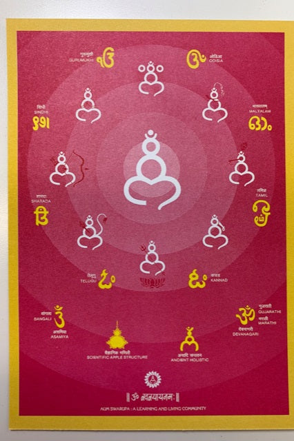Diese AUM-Postkarte bildet mittig eine grafische Darstellung von AUM in Wellenform, analog zu den Veden ab. Die weiteren AUMs stellen verschiedene indische Gottheiten und Planeten dar. Zu erkennen sind sie an den jeweiligen Utensilien/Qualitäten, die sie ausmachen. Gezeichnet nach Dr. Shri Balaji També.