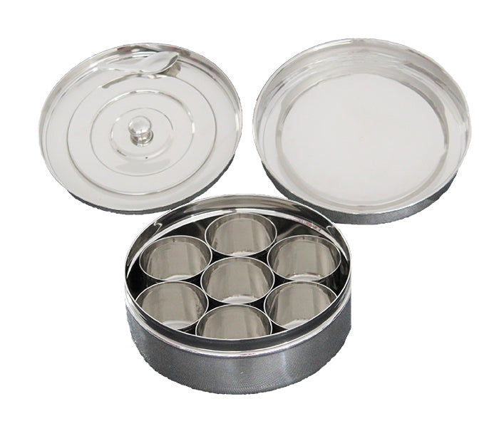 Mit diesem praktischen Küchen Utensil sind die Gewürze für jeden Tag mit einem Handgriff verfügbar. Ohne Suchen, Öffnen und Verstauen einzelner Packungen, mit Aromaschutz. Selbst die kleinen Löffel haben innen Platz. Nicht umsonst verdient die Masala Box den Titel „Herzstück der indischen Küche". Dieses Modell ist ein hochwertiges und formschönes Modell - stabil, alle Einzelteile sind fein verarbeitet und aufeinander abgestimmt. Mit ihr geht Kochen schnell und macht Freude!